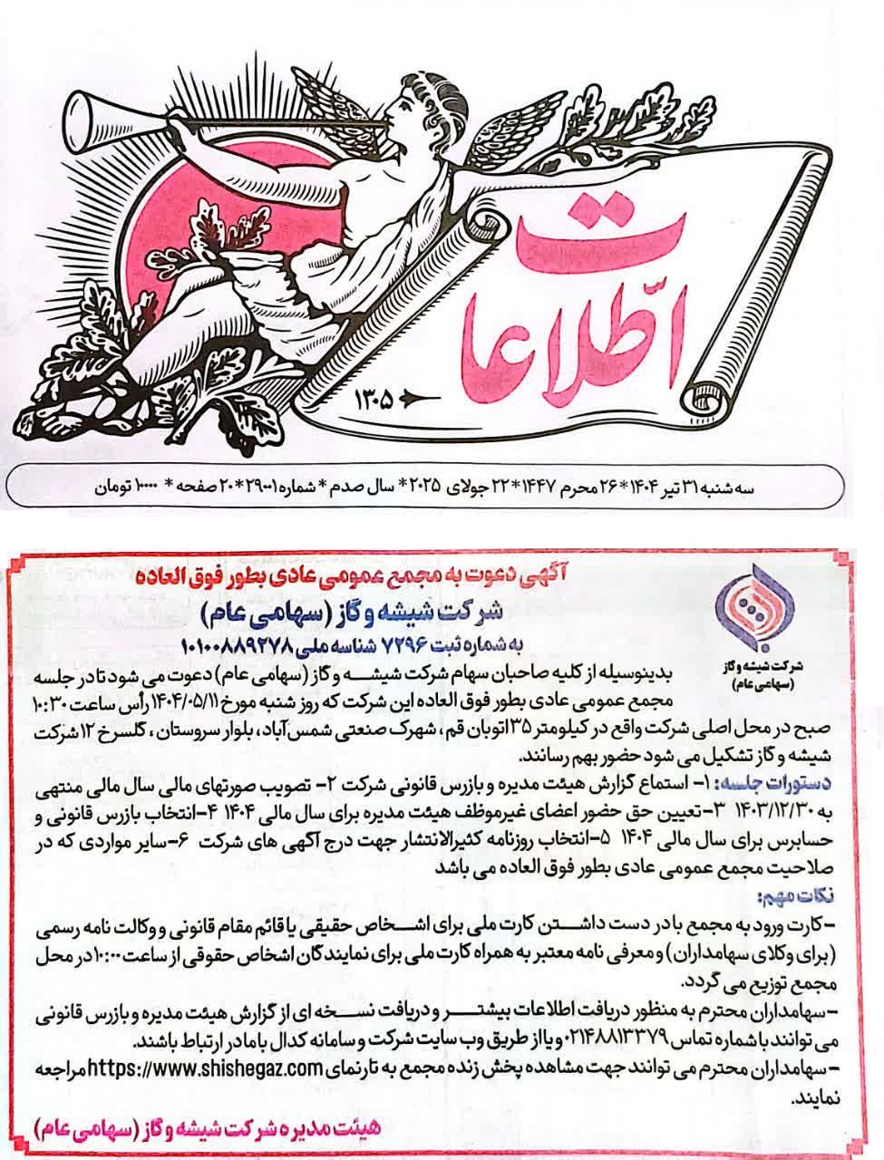 بدینوسیله از کلیه صاحبان سهام شرکت شیشه و گاز ( سهامی عام ) دعوت میشود تا در جلسه مجمع عمومی عادی بطور فوق العاده این شرکت برای سال مالی منتهی به 1403/12/30 که روز دوشنبه مورخ 1404/06/03 راس ساعت 10:30 صبح در محل اصلی شرکت به نشانی کیلومتر 35 اتوبان تهران قم شهرک صنعتی شمس آباد بلوار سروستان گلسرخ 12 شرکت شیشه و گاز تشکیل میشود، حضور بهم رسانند.